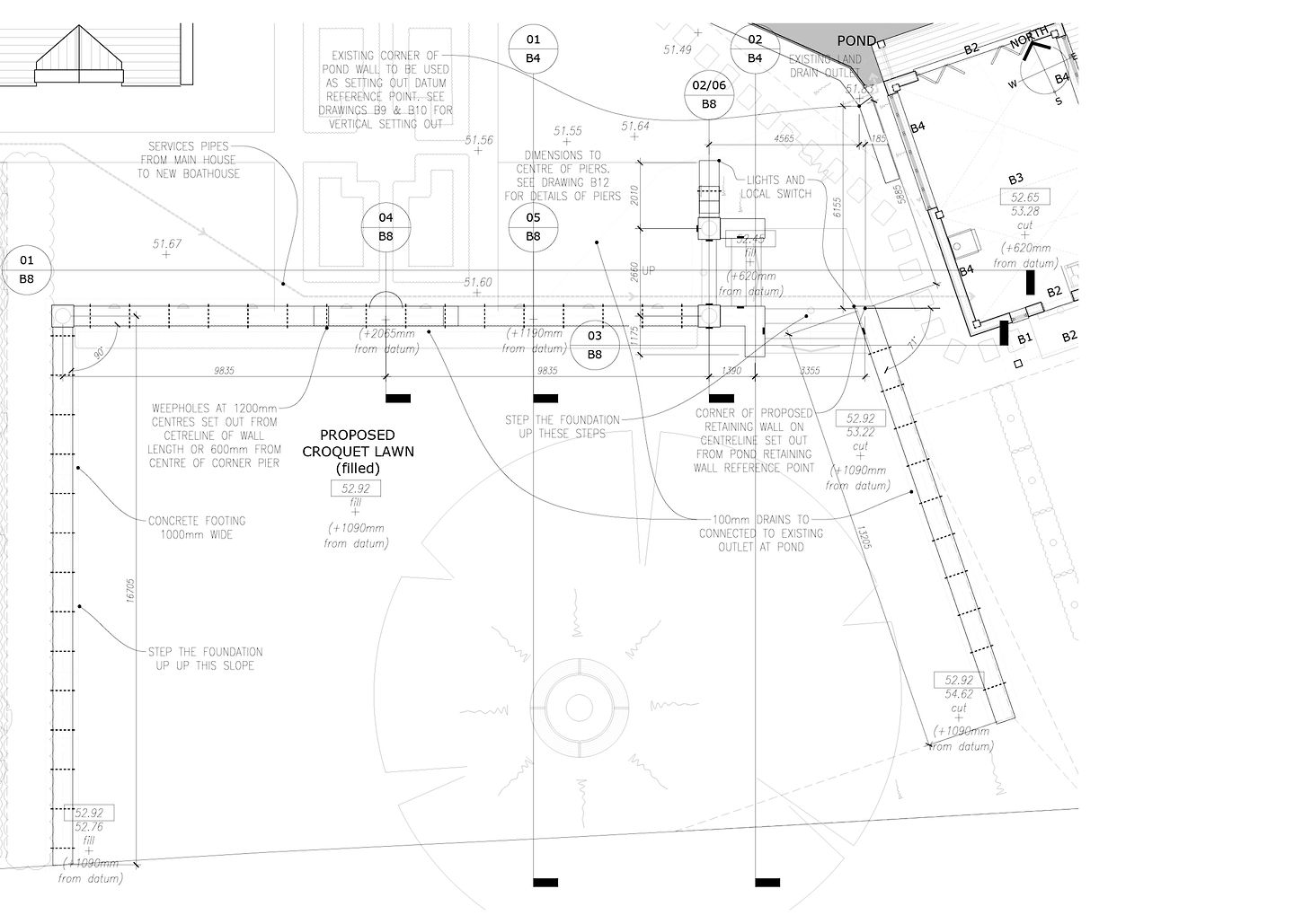 The structure features a steel floor frame that extends over the water, anchored back into the bank for stability, supporting an oak-framed, timber-clad building above. Architectural details, including roof pitches and proportions, were meticulously designed to reflect those of the main house. Extensive landscaping, incorporating retaining walls and tiered gardens, further enhances the seamless transition between the existing residence and the newly constructed boathouse.